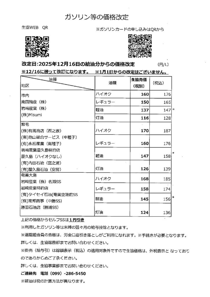 お知らせ 令和7年12月16日に遡ってハイオク・レギュラーガソリンは5円値下げとなります。※軽油・灯油の改定はございません。よろしくお願いいたします。 2025年12月25日 最終更新日時 : 2025年12月25日 yoshiike 随時ガソリンカードの申込みを受付しておりますガソリンカード申込フォームご不明な点がございましたら生協本部までご連絡ください。