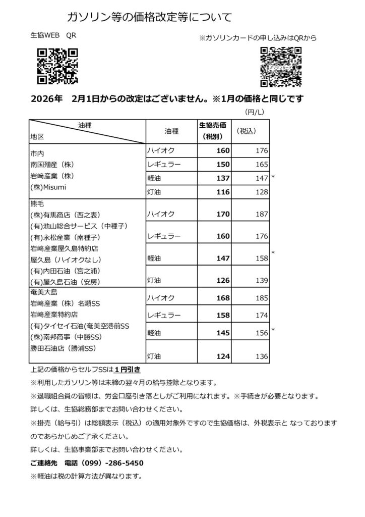 お知らせ※令和8年 2月のガソリン等の価格改定はございません。 2026年1月27日 最終更新日時 : 2026年1月27日 yoshiike 随時ガソリンカードの申込みを受付しておりますガソリンカード申込フォームご不明な点がございましたら生協本部までご連絡ください。
