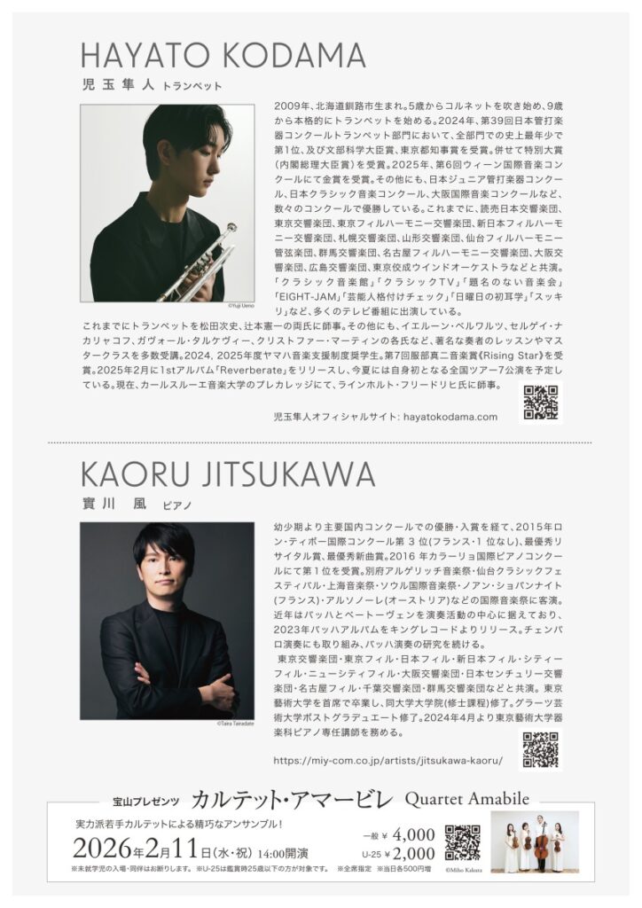宝山ホール 児玉隼人トランペットリサイタル 前売券発売中 2025年10月14日 最終更新日時 : 2025年10月9日 yuda 県職員本庁店にてチケットを発売中です。 発売期間:10/14~1/9 チケット価格:一般 4,000円 U-25 2,000円 ★U-25の席については入場時に年齢を確認できるものをご呈示していただく場合があります。