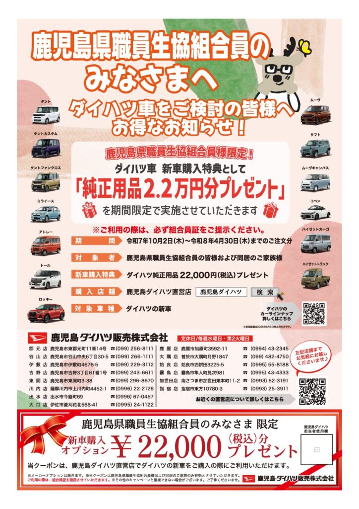 新規提携先のご案内(鹿児島ダイハツ販売(株)) 2025年9月30日 最終更新日時 : 2025年9月30日 yoshiike この度、(10月1日より)鹿児島ダイハツ販売(株)と提携しました。ダイハツ直営店で新車を購入されますと組合員限定の特典がございます。詳しくは下記のチラシをご覧ください。 ※初回ご来店時にチラシをお持ちになり、必ず組合員証をご提示してください。ご提示がない場合は組合員特典を受けられない場合がございますのでご了承ください。 組合員限定・組合員特典あり ※チラシをプリントアウトしてください。