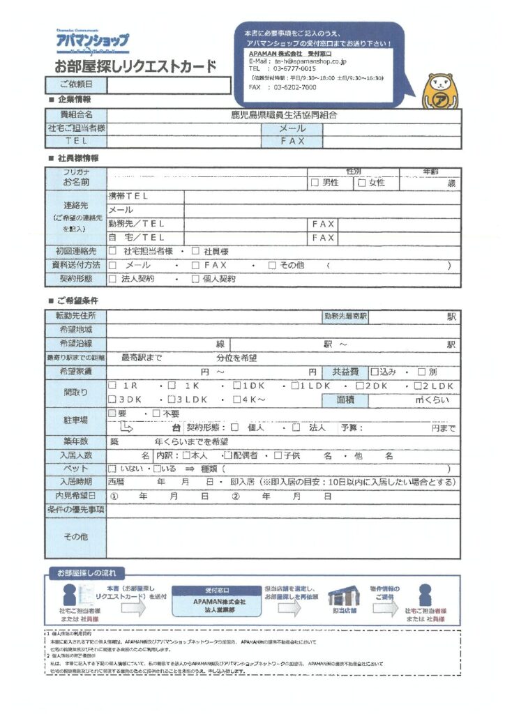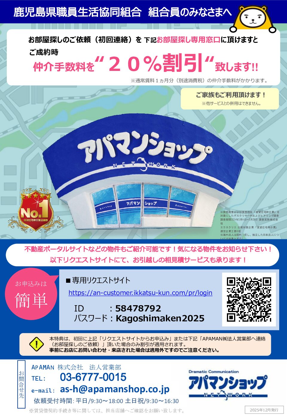 ※3 初回に組合員及びそのご家族様が、Apaman Property(株)法人営業部以外の選定店舗を含む店舗へ直接問 い合せをした場合は、組合員特典(仲介手数料の割引)が適用されませんのでご注意ください(県職員生協からの 紹介が前提条件のため)。