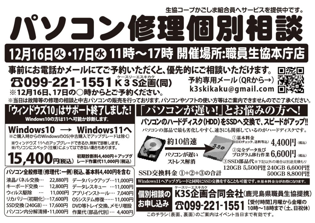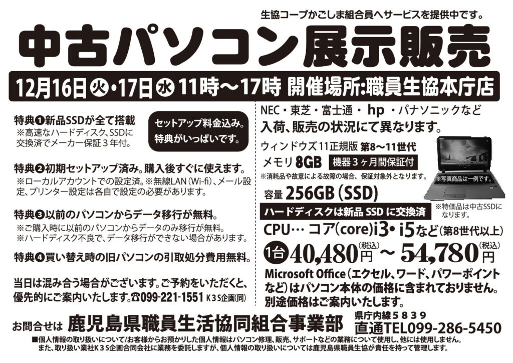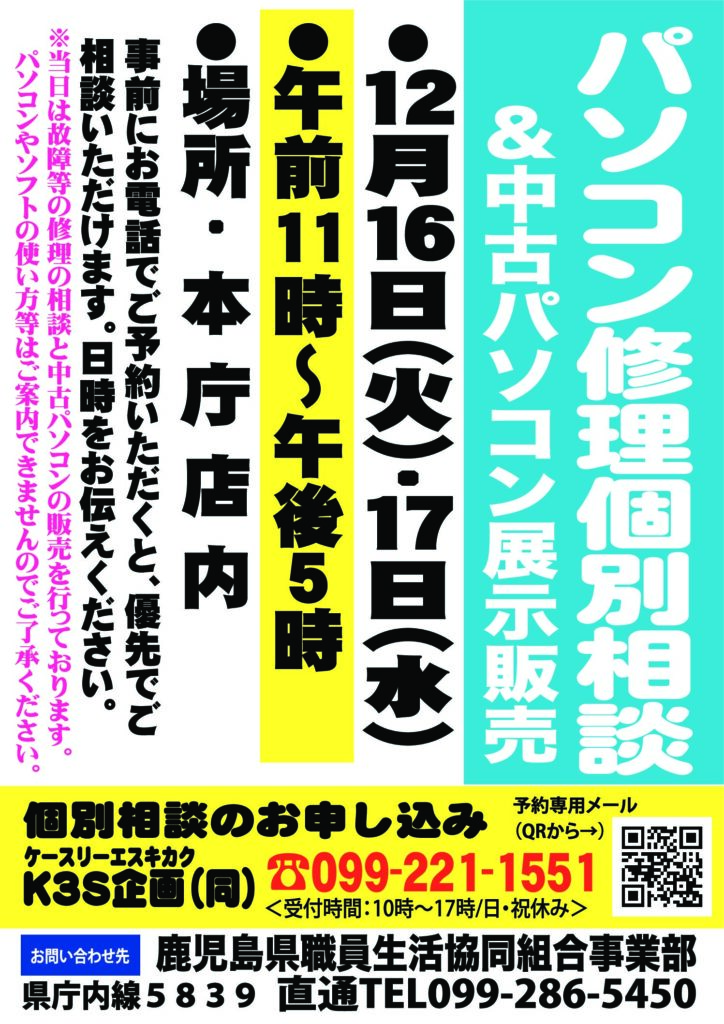 新規取引先のご案内!!K3S企画合同会社(中古パソコン販売・パソコン修理等)と契約しました。(生協コープかごしま組合員専用にもサービスを提供されてます。 2025年12月5日 最終更新日時 : 2025年12月5日 yoshiike お問い合わせは、直接K3S企画(下記をクリック)へ(県職員生協の組合員であることを必ず最初にお伝えください) ※お伝え・ご提示いただかなければ組合員割引を受けられません。 組合員限定・組合員割引あり K3S企画合同会社 ここをクリックしてください 12月16日(火)・17日(水)11時~17時 本庁店にて展示販売を行います。(予定)