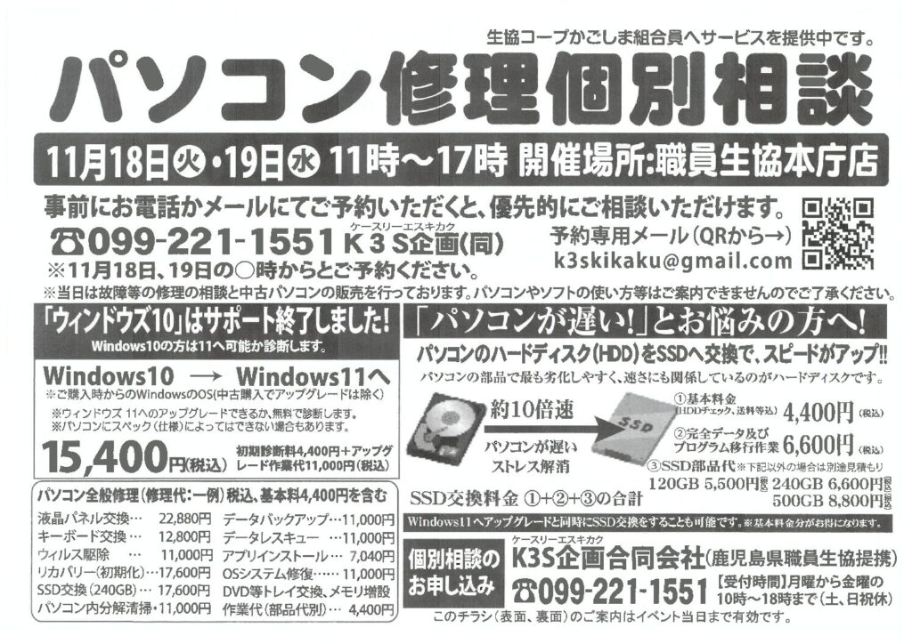 お問い合わせは、直接K3S企画(下記をクリック)へ(県職員生協の組合員であることを必ず最初にお伝えください)