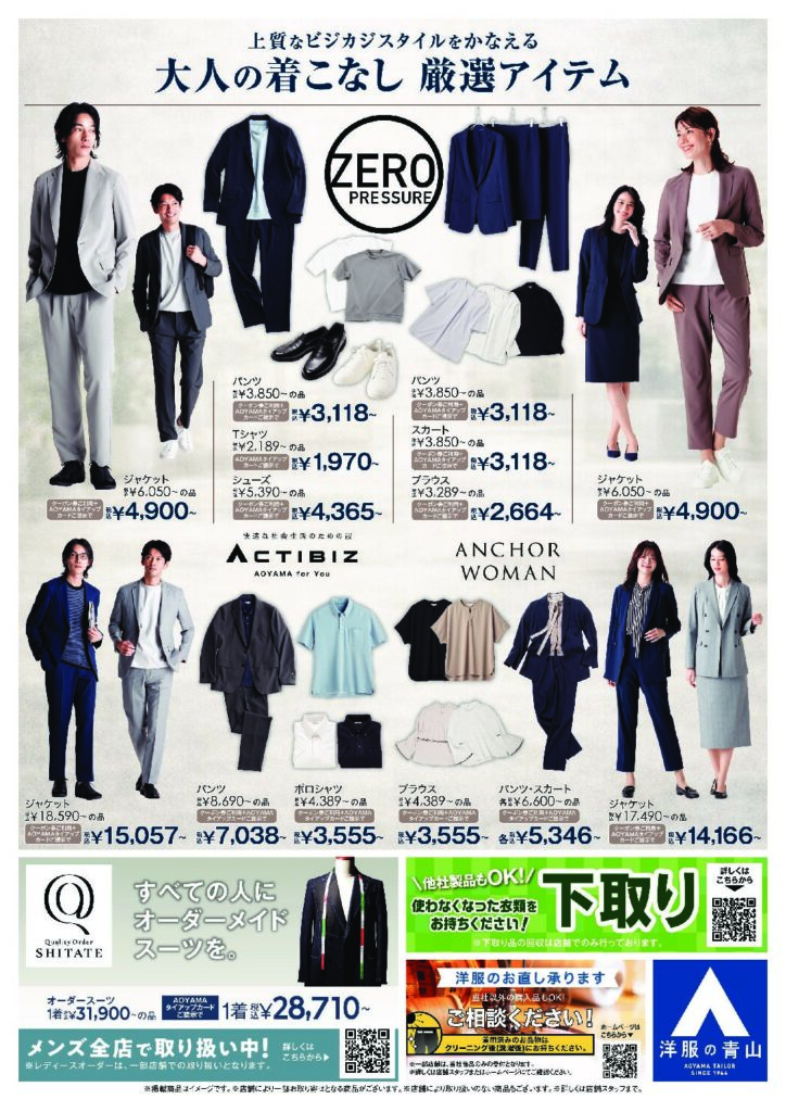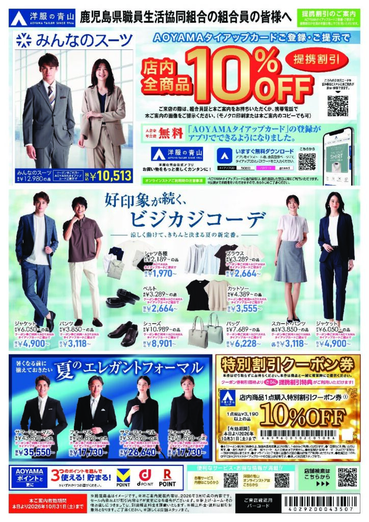 洋服の青山 セールのご案内 2026年4月7日 最終更新日時 : 2026年4月7日 yoshiike ご来店の際は、組合員証と本広告をプリントアウトしてお持ちいただくか、携帯電話で本広告の画面をご提示ください。(モノクロ印刷または本広告のコピーでも可) 青山商事より「洋服の青山」と「スーツスクエア」の提携割引のご案内です。 組合員さまはいつでもタイアップカード(無料)ご入会or提示で10%OFF!! チラシ・広告のクーポン券との併用も可能です! 全国の洋服の青山・スーツスクエアで是非ご利用ください。